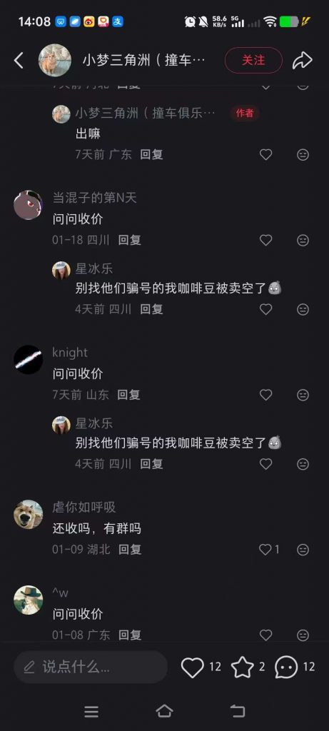 投稿人:有个诈骗团伙,假装是撞车俱乐部,实际上是上老板的号,把号租给自家打手或别人,还有一个专门的群,群名叫启航,不清楚是哪个俱乐部,群里有个小柒电竞,在抖音可以搜到,目前不清楚是不是帮凶,已经有很多人上当受骗了,估计规模很大